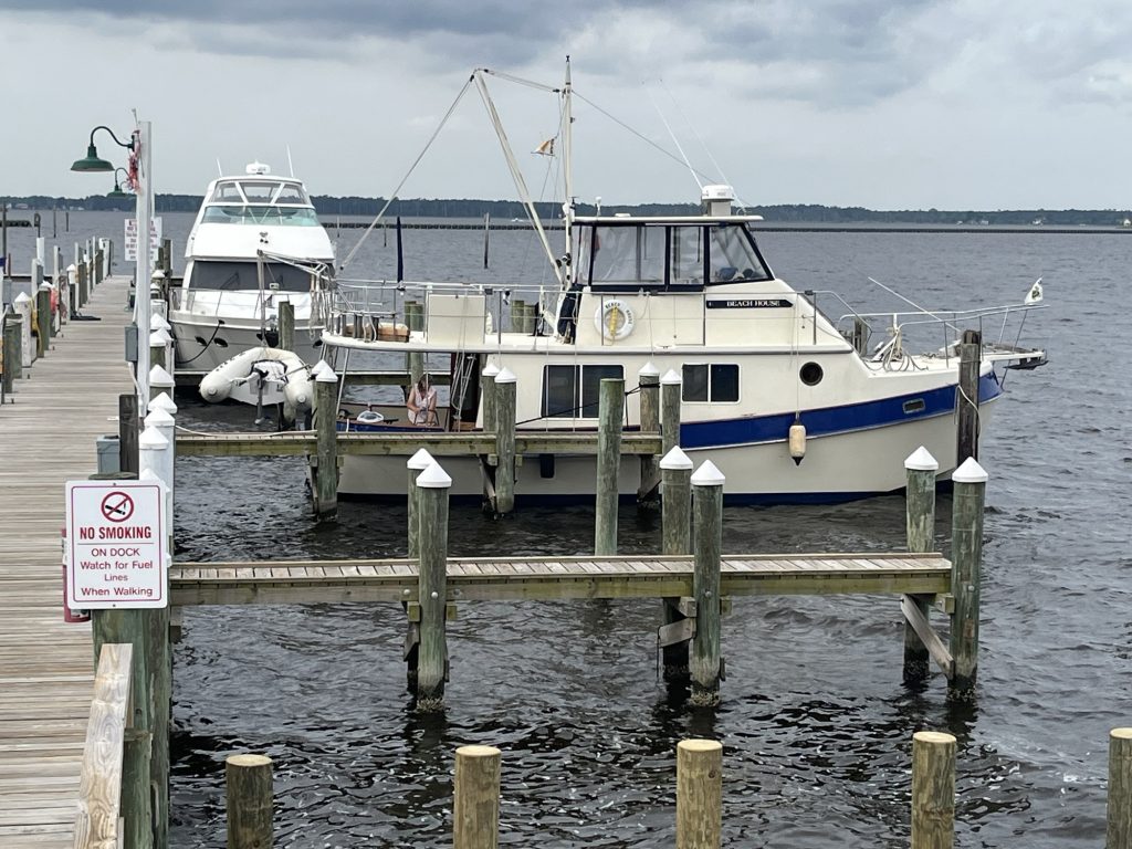 Then, the wind picked up. The Beach House began proving to old adage about a boat handling much rougher seas than the crew. We had the west wind on the bow. White capped waves were 2.5 feet with close spaced swells. We rode these for two hours and then changed destinations. Behind the breakwaters at Dunkirk the wind was still strong, and it took three passes before Dolly was able to put a stern line on a post at the town dock.